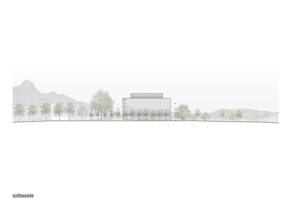 Auf freier Fläche entsteht ein Konzert- und Probenhaus, dass zwischen den verschiedenen Landschaftssituationen vermittelt. Der Entwurf nutzt den Naturraum als Kulisse und Anknüpfungspunkt und versucht zwischen innen und aussen, oben und unten dezidiert zu vermitteln. Die Volumen richten sich zum See sowie zur Stadt hinaus und spannen dabei in ihrer Mitte einen Hof auf. Die differenzierte Transparenz der Fassaden lässt dabei verschiedene Durchblicke und optische Verfremdungen zu. Der Konzertsaal wird als hölzerner Kubus in das Zentrum gebettet und erhebt sich in der Höhe visuell über das Bauwerk. Neben klassischen Konzerten, sollen auch Performances, Tanz oder Schauspiel ermöglicht werden. Sowohl der Hof als auch die Seeterrasse machen zudem Veranstaltungen unter freiem Himmel möglich. Der Entwurf versucht einen möglichst niederschwelligen Raum anzubieten, um dem Besucher die Hemmungen vor der Kunst zu nehmen und sie zugänglicher werden zu lassen. Die äussere Gestalt der Baukörper ist massig und leicht zugleich, die Tragwerksstruktur fein und die Fassade in mehren Schichten aufgebaut. Der grosse Logensaal wird im Norden von den Funktionsbereichen für den Betrieb umgriffen. Im Süden schmiegt sich das grosse Foyer, an dessen Seiten kaskadenartige Treppen verlaufen. Durch die Fensterfronten, welche mit unterschiedlichen Arten von Strukturgläsern verglast sind, kann das fakturierte Licht der Landschaft eindringen. Für den grossen Saal hingegen bildet der See Kulisse und Bezugspunkt; wenn die sich im Inneren befindenden Wendetüren geöffnet sind, ist der Blick auf den See frei.